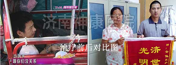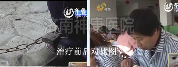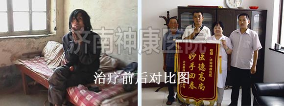 泰安马庄镇的村民巩大嫂患者有多年的精神分裂症,只要一发病脱了衣服就往外跑,看见围墙就往上爬,遇见邻居就破口大骂,丈夫为了防止妻子再次出去闯祸、扰乱邻居,无奈之下,只好用一根铁链锁住了她的双脚。2012年2月,巩大嫂的事件被媒体报道后,引起了神康医院的关注,经过一个月的综合系统治疗之后,巩大嫂面色红润了不少,生活已经可以自理了,自语自笑、妄想的症状也全部消失了,已达到临床有效治疗出院的标准。详情点击:女子精神分裂 丈夫铁链锁脚