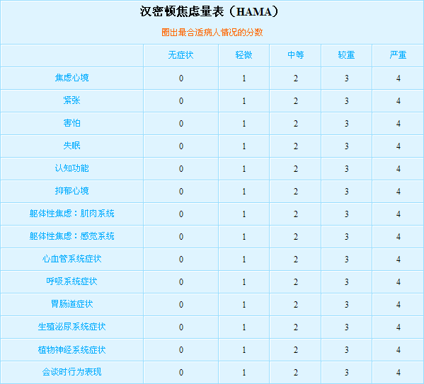 汉密顿量表(HAMA):由Hamilton(汉密顿)于1959年编制,包括14个项目,每项分5级评定,为经典的焦虑评定量表。总分超过29分,可能为严重焦虑;超过21分,肯定有明显焦虑;超过14分,肯定有焦虑;超过7分,可能有焦虑;小于7分,为无焦虑,一般取14分为焦虑分界值。量表又分出躯体性、精神性两项因子分,可进一步了解患者的焦虑特点。