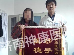 38岁的李洁因为婚姻受挫而患精神分裂症,胡言乱语、自言自语、到处乱跑,严重时会不停的甩头、手舞足蹈等症状。经过两个疗程的治疗,她带着医护人员的祝福开始正常的生活。她还亲自送来锦旗表示对医生的感谢。